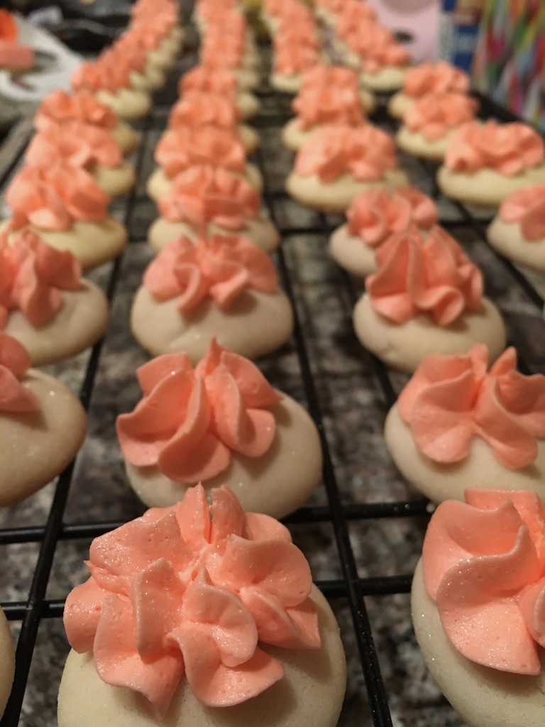 Directions for Cookies: 1. Preheat oven to 350 degrees Fahrenheit. 2. Cream butter and sugar, then add vanilla extract. Whip until fluffy and smooth. Do not overwhip in this step or your cookies will come out dense! 3. Sift flour and salt together, then add to your butter/sugar mixture. Blend together until ingredients are combined, but slightly crumbly. 4.Add milk and blend a little longer until dough is smooth and slightly clumpy. 5. Roll into 1 inch balls and flatten into disks. Place onto a baking tray lined with parchment paper. Cookies will spread slightly when baking. 6. Bake for 10-12 minutes until bottoms are lightly golden brown. 7. Cool on a baking sheet and then frost!